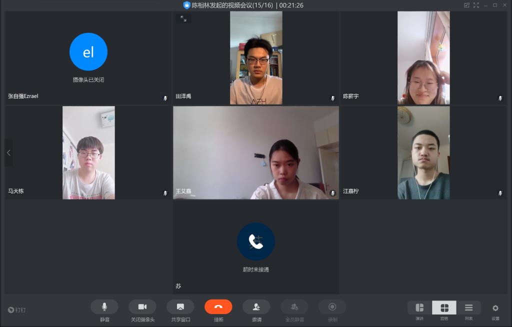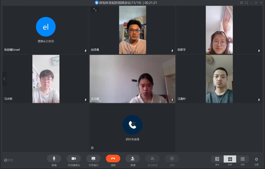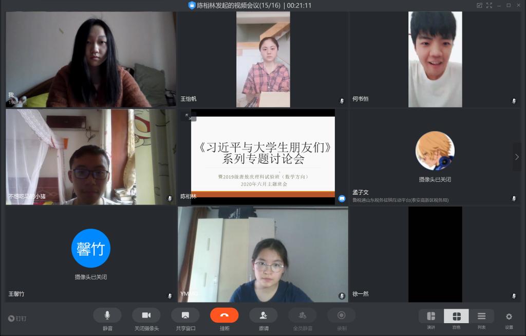 最后我们请各位同学谈了谈自己的线上学习经验。首先因为我们请选择不同选修课的同学代表分别介绍了一下自己所选择选修课的上课方式、上课感受、课后作业以及课程收获等等,这样可以对我们未来学习生活选择不同的课程提供宝贵的参考意见和帮助;其次我们请班级内学习优秀的同学为我们介绍了专业课数学分析和高等代数的学习方式以及一些学习上的建议,最后,由班长和团支书对以上内容做了收尾和总结。