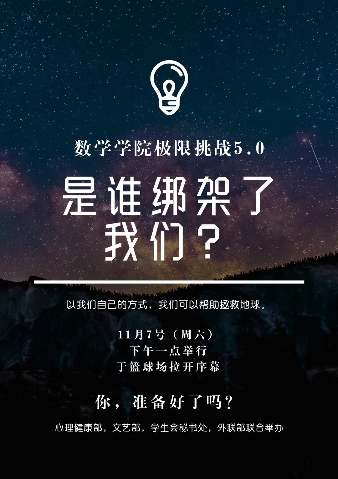 极限挑战是一个以剧本杀为背景,以各种各样的有趣的游戏为主体的大型综艺式活动。活动前后分为篮球场,轮滑场,体育馆三个场地,共进行了7个游戏。游戏不只是对个人的知识涉猎面,反应能力,运动能力的考验,更是对团队分工协作能力的考验。