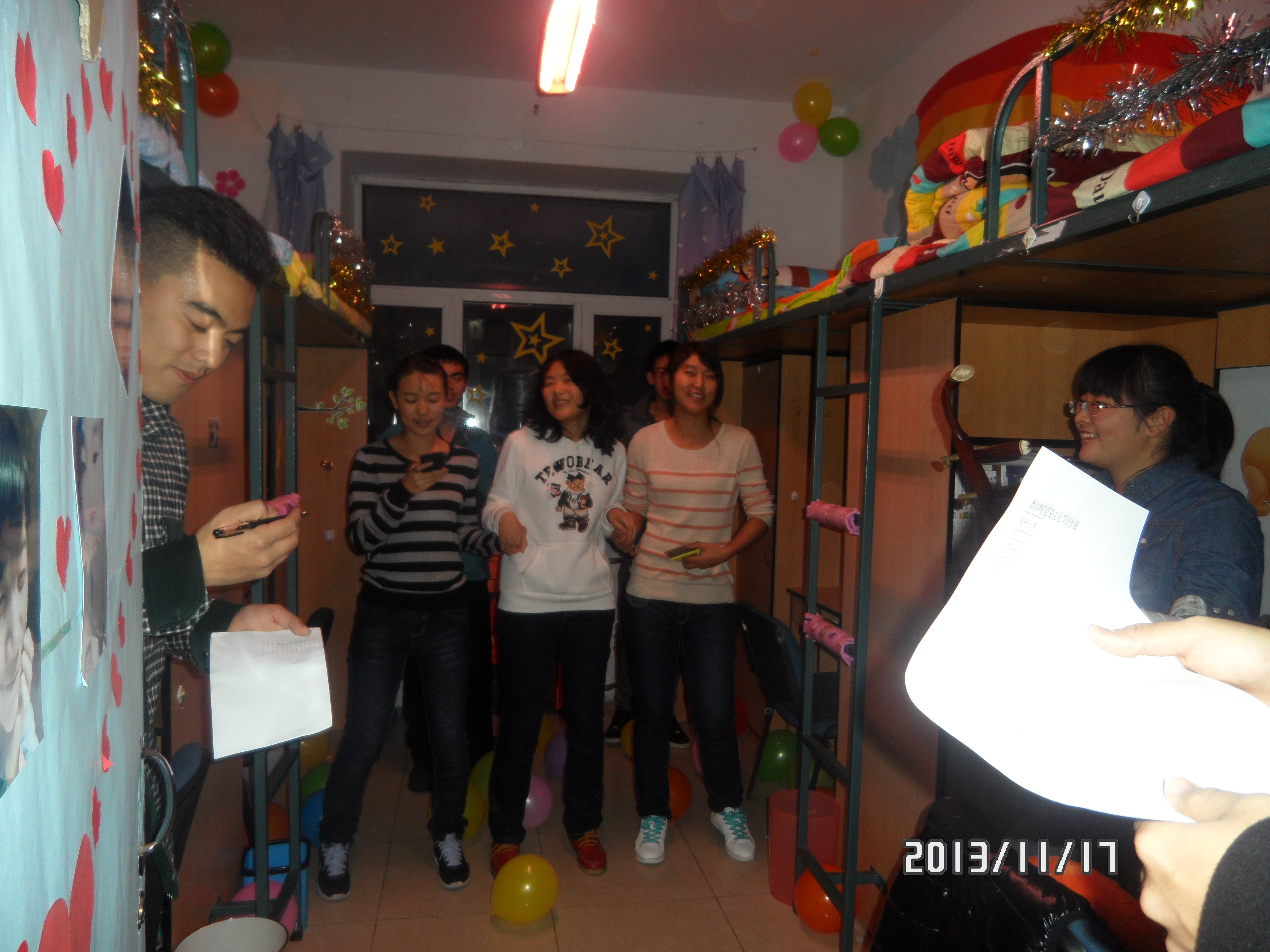 11月17日下午四点,由公海gh555000aa线路检测员工会女综部主办的2013级寝室文化节女生部分顺利展开。学工办主任崔帅老师、辅导员申川老师,员工会主席王艺霖、团委副书记迟仲达、社团联合会主席齐霄虹以及其他一些员工干部作为评委参加此次评比活动。