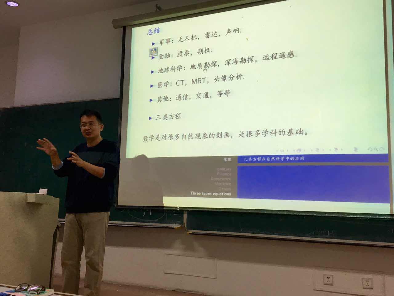 下午1点整,张凯老师开讲。首先,张凯老师图文结合地阐明了计算数学在军事、金融、地球科学、医学等方面的重要应用。接下来,张凯老师结合自身经历,诠释了三类方程在今后职业发展中的帮助。最后,张凯老师关掉投影,拿起粉笔,书写员工实例讲述未来发展的无限可能;走下讲台,闲话家常,用过来人的体悟规勉迷途的员工。