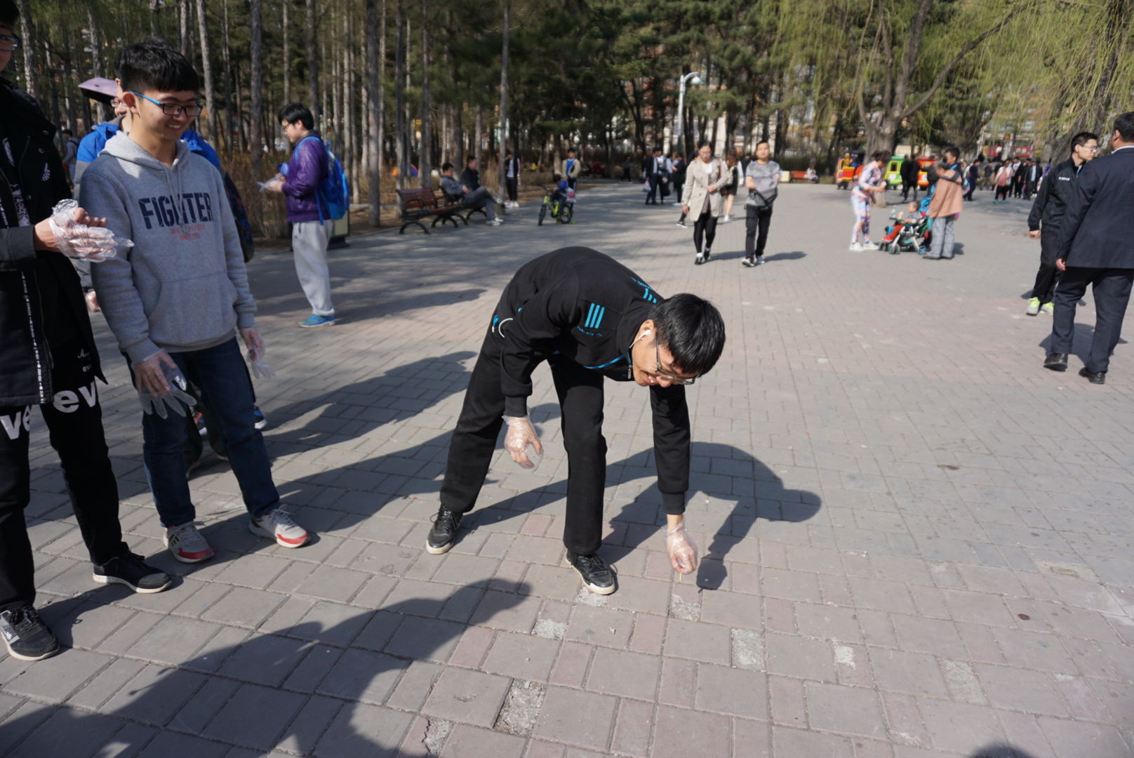 经过前期的宣传,有近百人报名参加了此次活动。由同学们选报的地点和人数进行平均分配,共分成了14个小组,于4月16日下午两点在指定地点集合。同学们积极参与活动,认真仔细的寻找周围的垃圾。在耀眼的阳光下,穿梭的人群中,同学们弯下身子,捡起地上或大或小的垃圾并扔进就近的垃圾桶中,此行为获得了路人的驻足和赞叹。每一位同学都没有在意灰尘和污渍,认真的拾起地上的垃圾,从塑料瓶到烟头,任何会带来污染的物品都不放过。