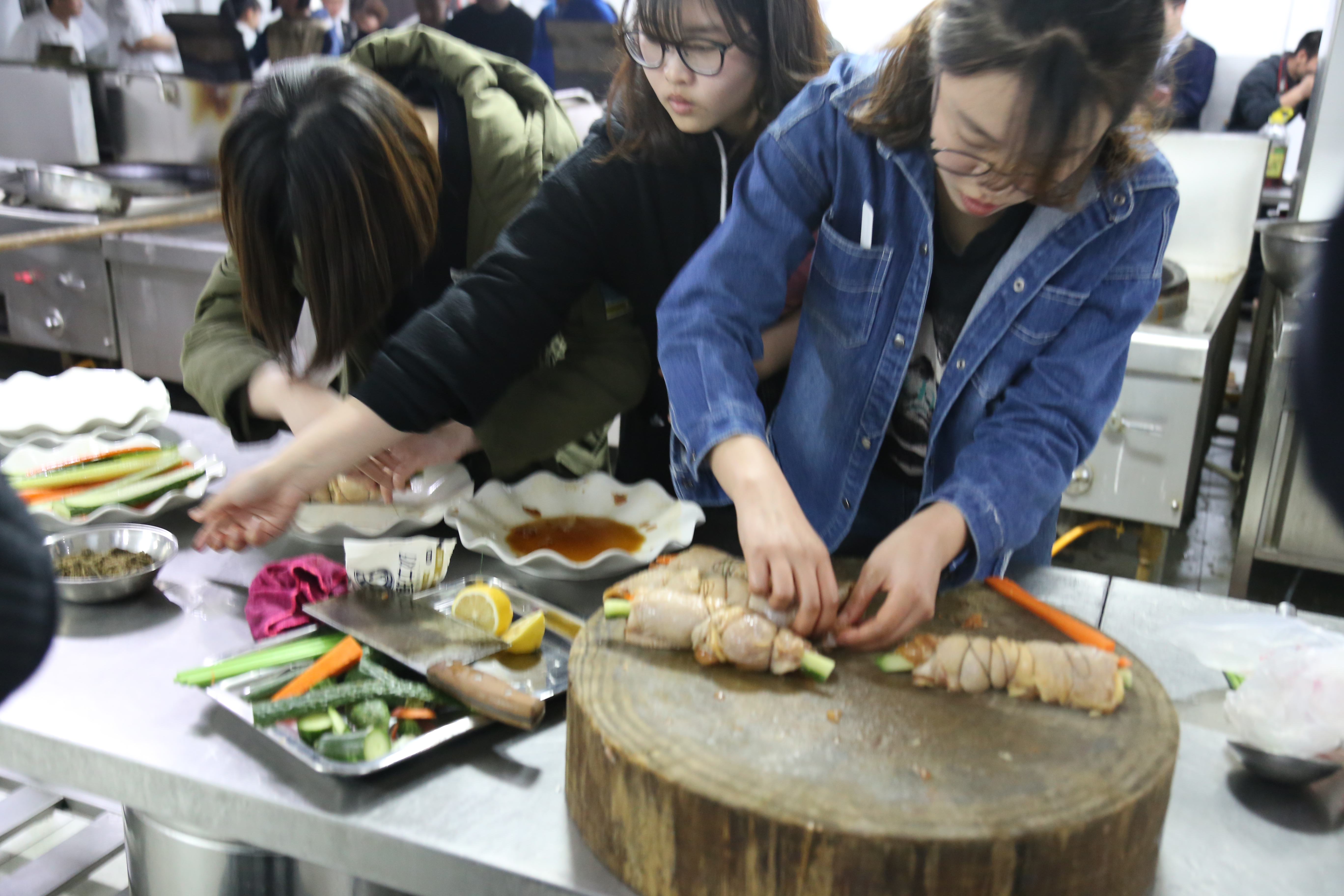 大家再次来到了后厨,观看大厨们一展身手。拔丝山药、拉面哥的拉面、甚至还有在新食堂一号难求的雪衣豆沙等平时难以吃到的美味,让小吃货们一脸满足。小编印象最深的就是拉面哥那剪不断理还乱的拉面啦,有细面与宽面两种,虽然只放了最简单的盐等基本调料,甚至连点缀也没有,但是那弹弹的面吃进嘴里,却胜过千滋百味。享受完美味之后,评审团根据现场比拼小组们的菜品的色泽、营养、摆盘和味感质感给出了公正的评分。最终,冠军产生!现场比拼:冠军:百鸟朝凤,亚军:素香虾仁,季军:咖喱遇上鸡。
