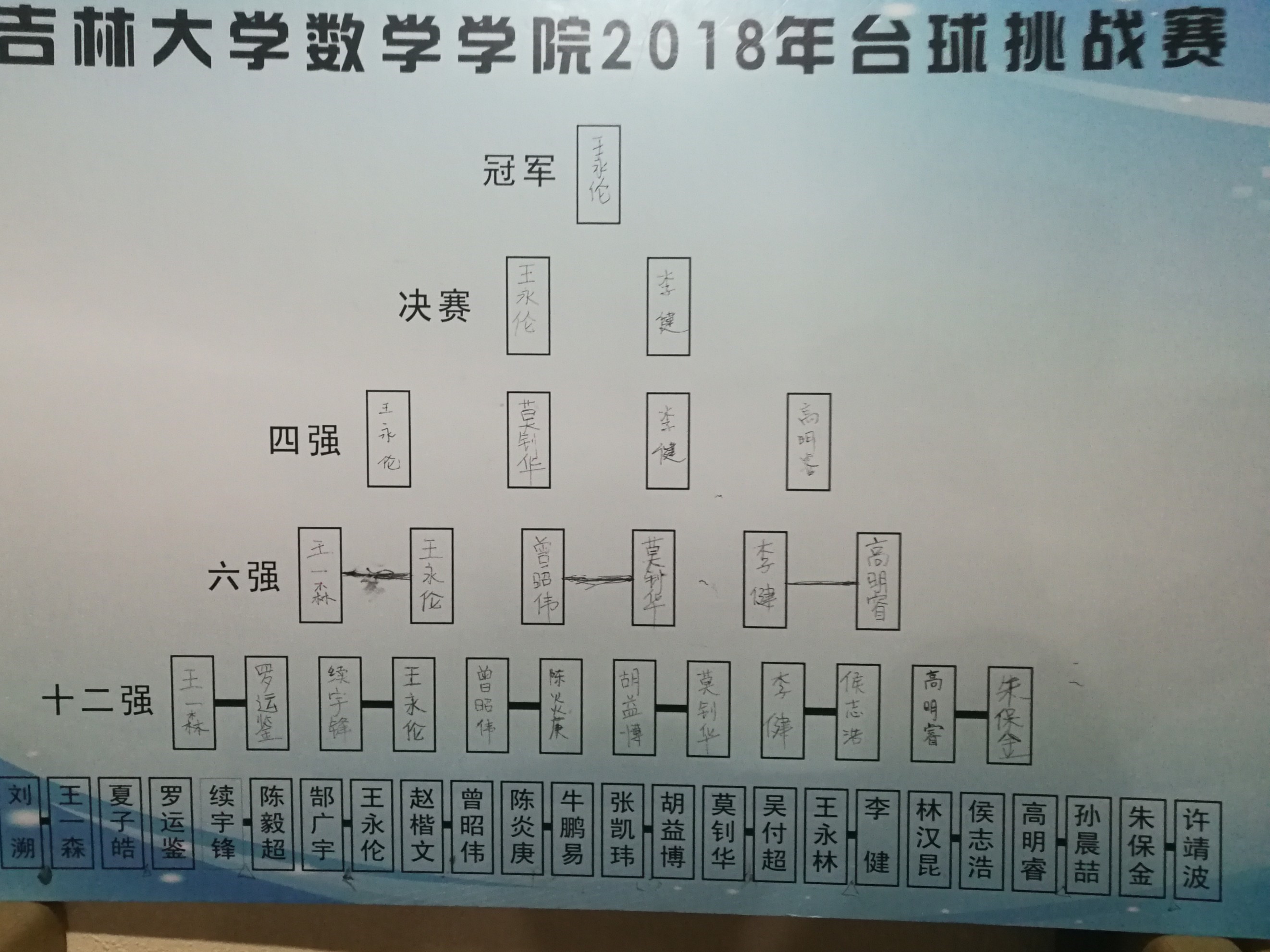 6进3的比赛中,几组对决都精彩纷呈,展现出了难分难解的架势,王一森尽管手感细腻,但处理球方面终究还是抵不过大四学长王永伦,最终遗憾败北,李健凭借精准的远台进攻战胜了实力同样超强的高明睿,莫钊华由于对手的弃赛也成功晋级,在四强附加赛中,王一森在先领先的情况下痛失好局,惨遭逆转。两组半决赛对决由王永伦对高明睿,李健对莫钊华,王永伦和李健凭借稳定的手感和过硬的心理素质会师决赛。