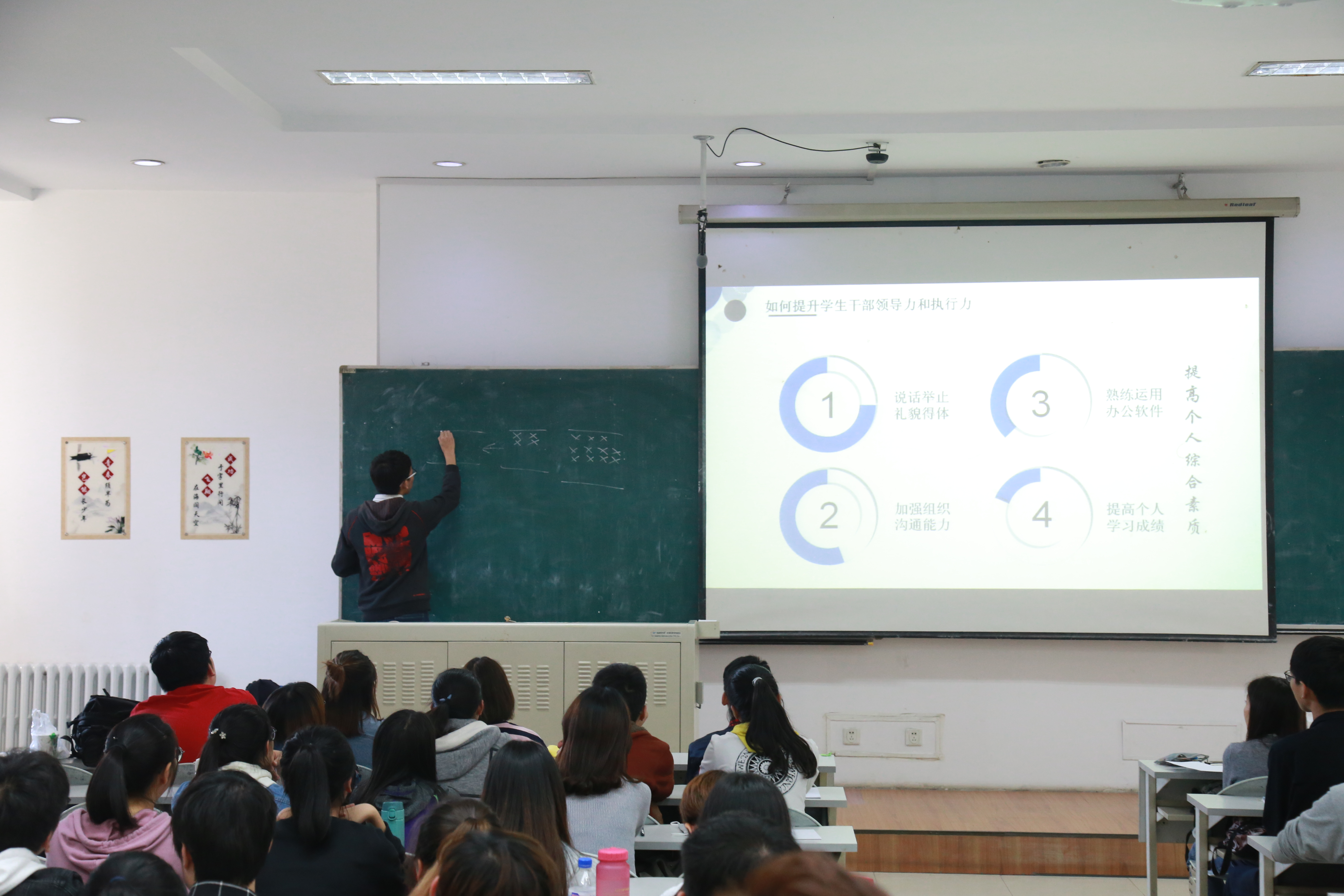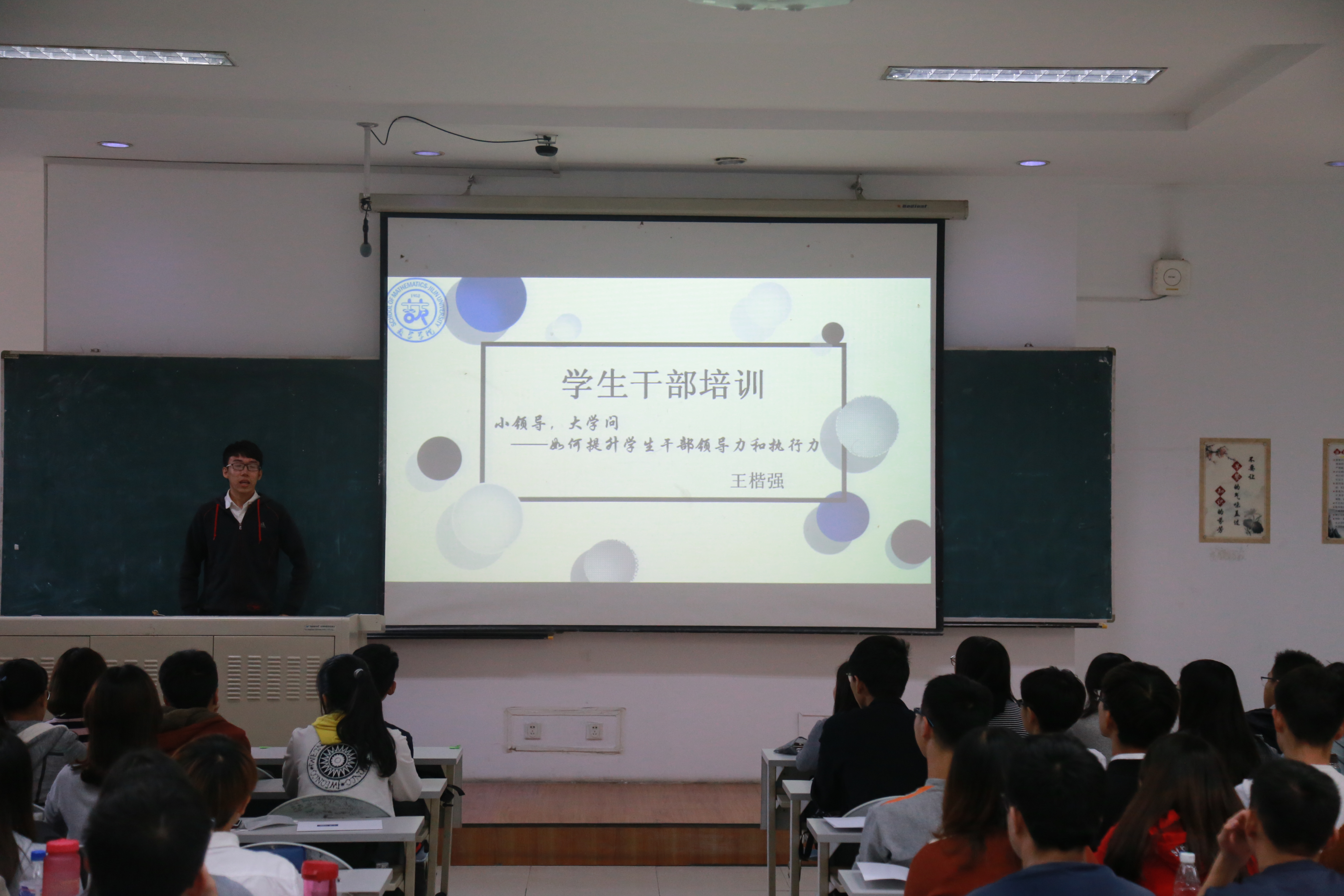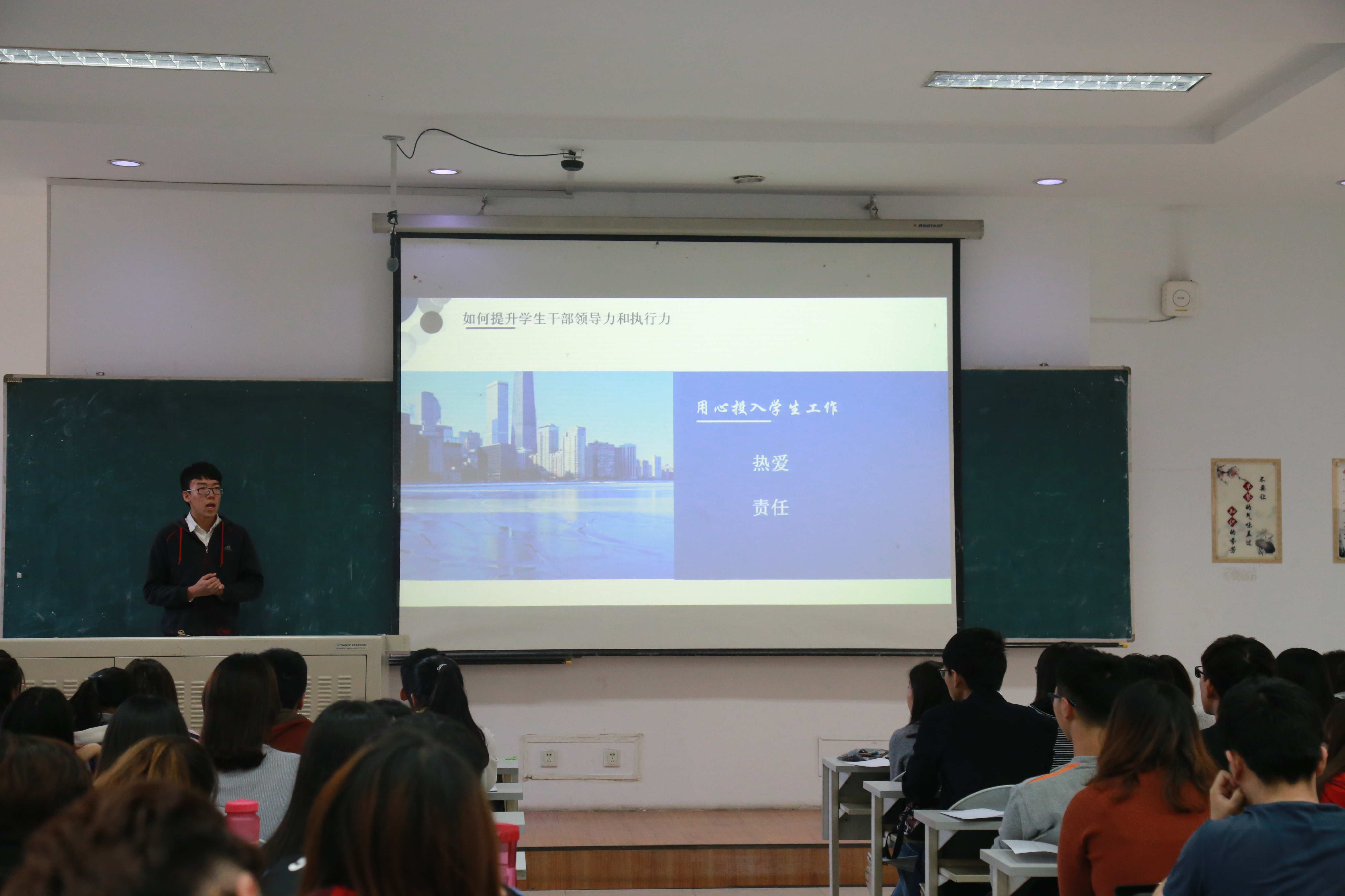 第一堂课“小领导,大学问--提升员工干部领导力和执行力” 由员工会副主席王楷强主讲。王楷强首先让大家思考了一个问题:为什么要加入员工组织做员工干部?只有将这个问题思考清楚,才能定位好自己在部门中的角色。他认为做员工工作最重要的是热爱和责任,是用心投入。接下来,他从说话举止礼貌得体、熟练运用办公软件、加强组织沟通能力、提高个人学习成绩四个方面讲述了如何提升个人素质。其中,他提到工作时态度积极、认真细心、拒绝拖延等良好的行为习惯会带来高效率和高质量,起到事半功倍的效果。王楷强举了很多自己的实例来告诉17级的员工干部,作为各员工组织的副部长,一是要起到模范带头作用,二是要学会合理规划安排工作,三是要端正态度敬畏规则。最后,王楷强补充了举办活动时报账工作的具体流程,希望各部门之间能够相互配合,提高效率,不做重复性工作。