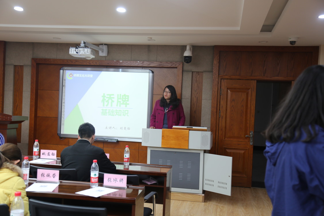 首先,由永和桥牌社社长李子钰同学为我们简单的介绍了桥牌是什么,桥牌为什么受欢迎,玩桥牌的好处以及桥牌在吉大的发展等等。同时,李子钰同学与台下同学们提问互动,台下同学们积极回答问题。然后,由公海gh555000aa线路检测团委副书记兼社团联合会主席赵雯晗为吉林省桥牌协会颁发特殊贡献单位奖,员工会主席邱韵为长春市桥牌协会颁发特殊贡献单位奖,由团委副书记李潇琦为刘曼怡颁发特殊贡献个人奖。再接着,资深桥牌达人刘曼怡为我们讲解了基础桥牌知识,桥牌到底该怎么玩。刘曼怡为我们到场的每个人都布置了在线桥牌练习,大家也都纷纷拿起手机下载app,然后开始试玩。刘曼怡带着台下的同学们分析每个练习的出牌策略,让我们从对桥牌的一无所知到成为入门新手。