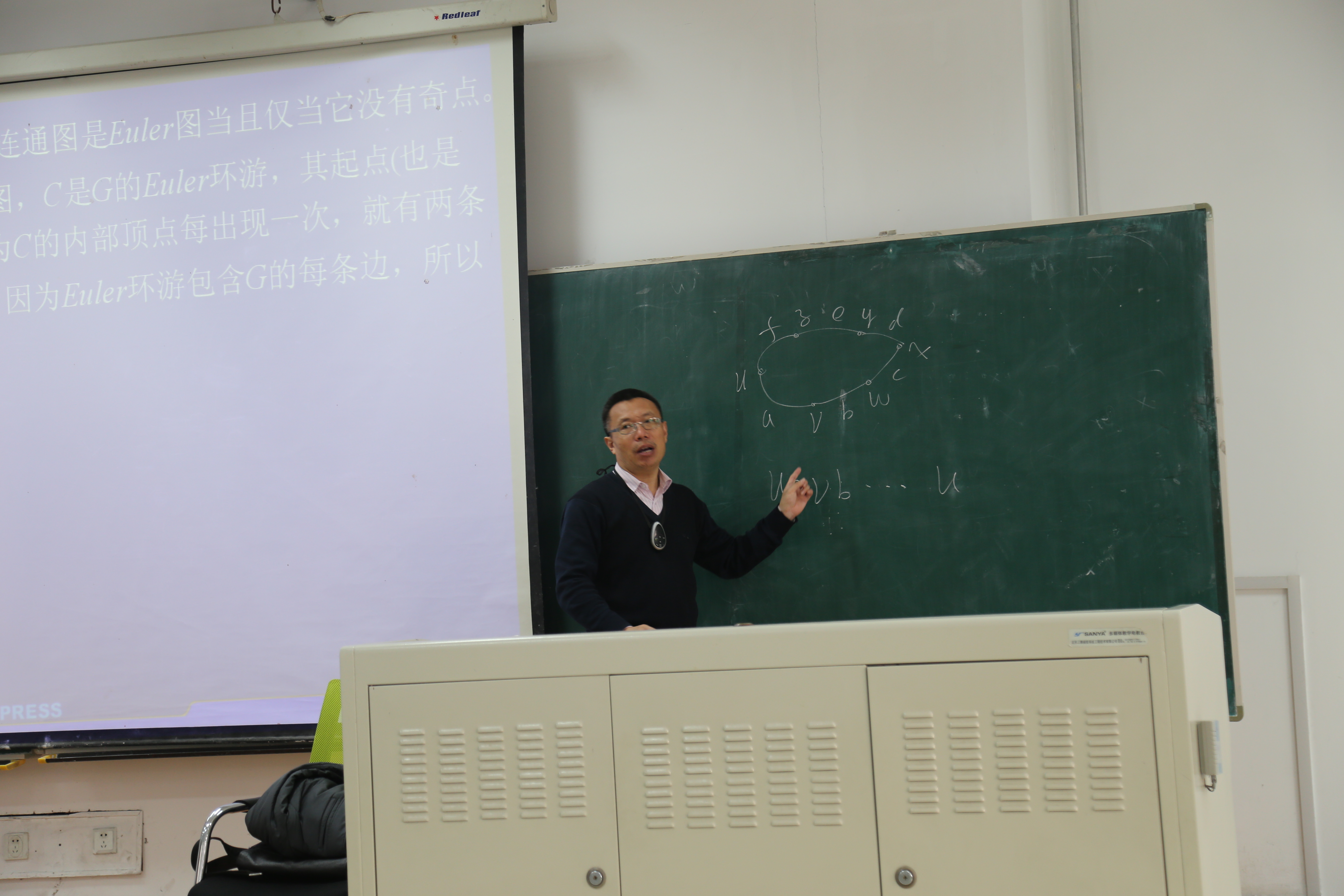 首先,刘长春老师向大家介绍了公海gh555000aa线路检测的5大专业及其基本概况,以及公海gh555000aa线路检测员工在本科时期要学习的全部课程。随后又详细介绍了公司计算数学的团队队伍、专业方向、研究方向。紧接着,刘老师通过几张简单的几何图形向大家引入Euler图的定义,由浅入深,又向大家介绍了Euler图的相关定理。老师通过对定理的证明,不仅介绍了一个非空连通图是Euler图的充分必要条件,还潜移默化地教授给大家定理证明的方法。在座的同学们听得津津有味,同学们根据老师在黑板上画的简易的图解以及对问题精准的剖析,渐渐加深了对Euler概念的理解,也对这个陌生的概念有了更多自己的思考。最后,老师特别为大家提供了答疑环节,以解答同学们在本次课程乃至数学学习方面的困惑。