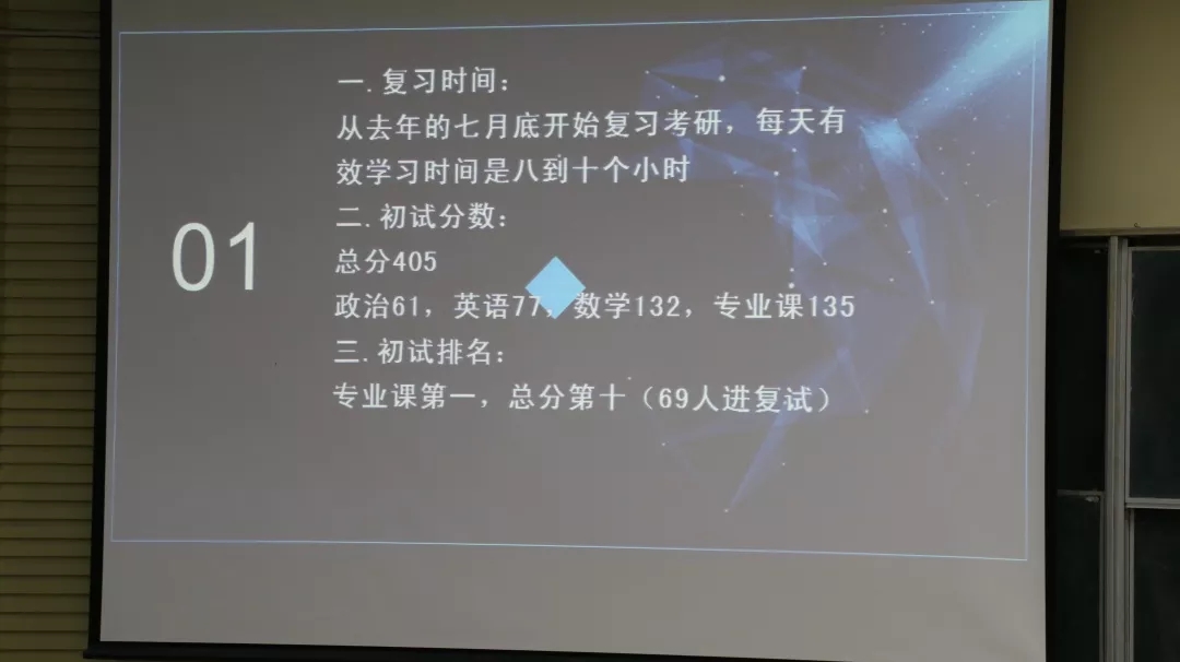 辛悦学姐向我们简述了考研考试的流程时间表、注意事项等,给我们传授了关于考研方法的经验,推荐了适合不同阶段高质量的参考书。单瑞彤学长分享了他考研的参考书目以及他对考研的看法,要尽早明白为什么去考研,考研的目标是什么。要调整好心态,懂得坚持会让你走得更快。考入中国科学技术大学的李鹏飞学长针对报考择校给我们详细地分享了他的经验。刘博学长则是从他考研的自身经历出发,提醒同学们英语的重要性,以及要多了解报考公司的相关资讯。考入中央财经大学的厍馨予、董倩学姐则向我们讲解了一些相近的概念,比如专硕和学硕,全日制与非全日制,定向与非定向。考入中国人民大学的隋尚廷和闵鹏瑾学长也提出了自己的学习方法用以参考。考入北京师范大学的庄珊珊和王晗学姐提醒了我们在考研初试复试上事先掌握好时间、考点,是否需要住宿等一些注意事项。考入其他名校的学长学姐也关于个人经历、考研准备、择校报考及注意事项等方面,全方位、多层次地进行了讲解。