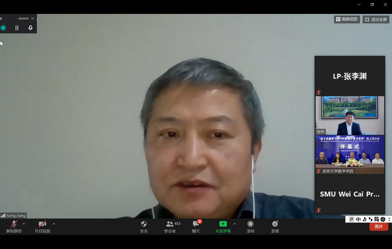 研讨会上,普林斯顿大学鄂维南院士、浙江大学包刚教授、哥伦比亚大学杜强教授、北卡罗莱纳州立大学蔡伟教授、布朗大学George Karniadakis教授、洛桑联邦理工公司Jan S. Hesthaven教授、上海交通大学金石教授、北航刘铁刚教授、俄亥俄州立大学修东滨教授等17位来自国内外高校的顶级数学家和青年学者做了精彩报告,深度研讨基于机器学习的偏微分方程数值算法的关键问题,共同寻求偏微分方程数值算法在诸多应用领域的解决方案。与会的学者们通过线上语音或留言提问,专家们在线实时解答,互动场面热烈、交流深入。
