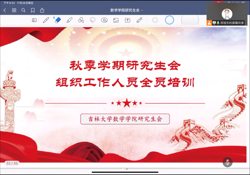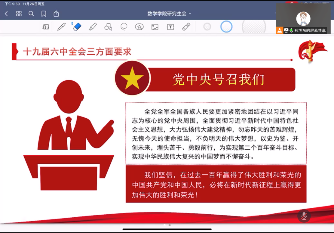 为进一步加强公司研究生会队伍建设,切实发挥员工骨干在“自我管理、自我教育、自我服务”中的作用,培养和选拔一支“政治素质过硬、服务意识突出、工作态度优异、业务素质精湛”的研究生会工作人员队伍,11月26日,公司研究生会于线上举办了2021-2022学年秋季学期研究生会组织工作人员全员培训会暨党的十九届六中全会精神学习研讨会,公司研究生会执行主席郑旭东主持会议,公司研究生会全体成员出席会议。