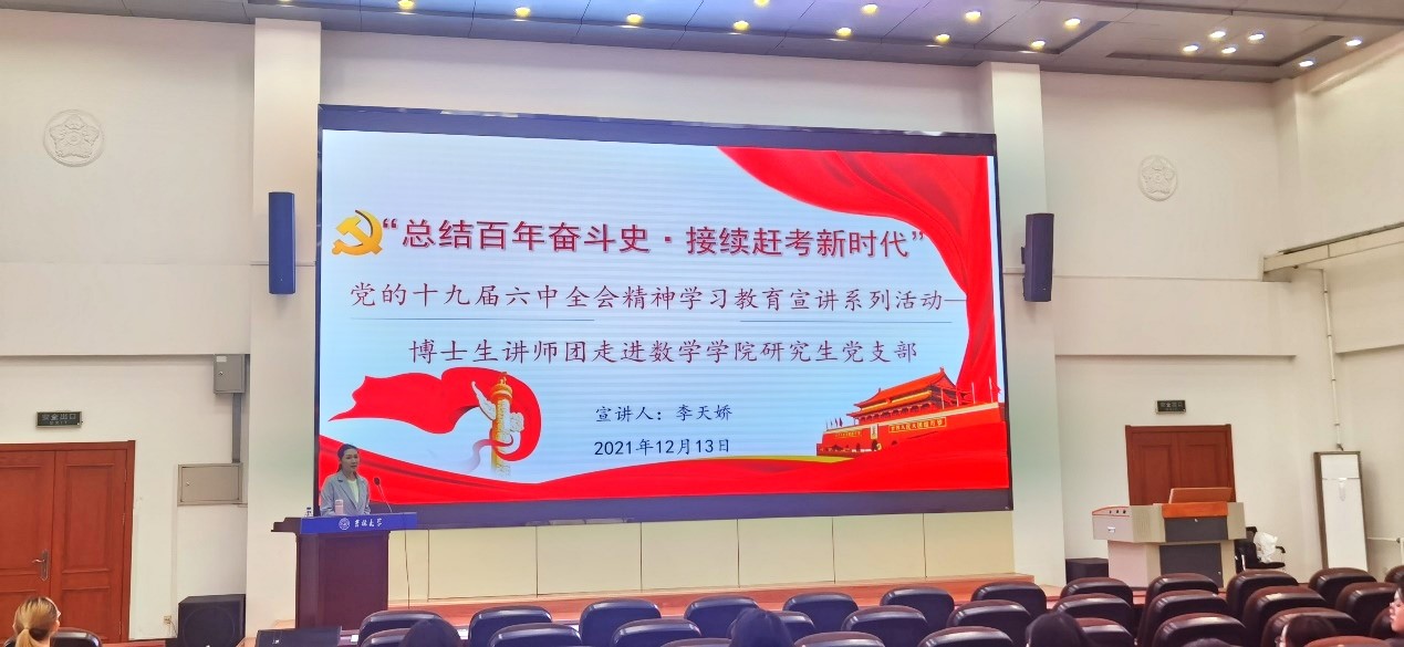为深入学习贯彻党的十九届六中全会精神,提升广大研究生思想政治素质,积极响应公司党委研究生工作部工作要求,2021年12月13日,公海gh555000aa线路检测邀请公海gh555000aa线路检测博士生讲师团讲师李天娇博士于数学楼二楼报告厅进行了十九届六中全会精神学习教育宣讲。本次宣讲的主题为“总结百年奋斗史•接续赶考新时代”——新中国以来国家领导人新闻发布的机制演变与基本经验”,公司研究生党支部党员、预备党员、积极分子参与了此次宣讲活动。