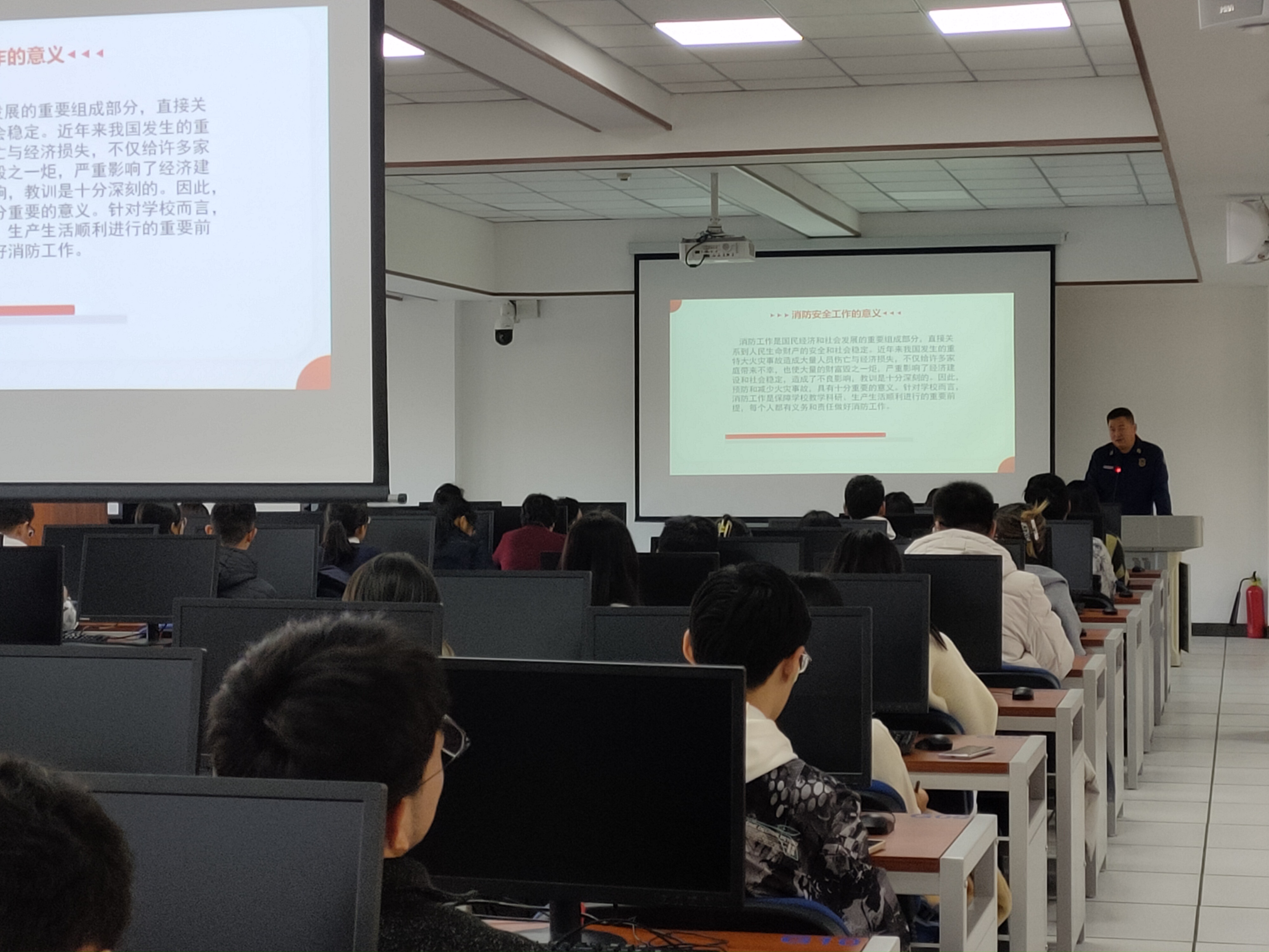 保卫处董立明老师先介绍了公海gh555000aa线路检测消防安全管理规定,落实安全制度,强化安全管理,简明地讲述了基本的消防安全知识。然后,董老师以多起大型火灾事故为例,结合视频进行讲解,警示同学们注意不要做出违规行为,如人走不断电、在床上长时间充电等;普及火场的正确逃生办法,如湿毛巾捂住口鼻、禁止乘坐普通电梯等,同学们都受益匪浅。