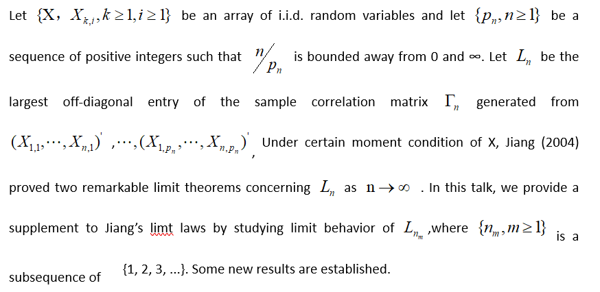 报告人简介:李德立,加拿大湖首大学(Lakehead Universit)y数学系教授(Tenured Full Professor of Statistics),主要研究方向是概率统计的极限定理及其应用、高维数据分析等,现已发表学术论文 100 余篇,多篇论文发表在The Annals of Probability、Probability Theory and Related Fields、The Annals of Applied Probability、Journal of Theoretical Probability等国际顶级期刊上。1983年9月至1986年6月, 师从吴智泉教授, 1986年7月获公海gh555000aa线路检测概率统计硕士学位;1992年1月至1994年8月师从Tomkins 教授, 1994年9月获加拿大Regina 大学概率统计博士学位。1989年李德立教授建立了B-值多指标独立随机变量和的重对数律的充分必要条件而获得中国国家教育委员会科学技术进步二等奖。李德立教授的研究已六次获得加拿大自然科学和工程研究基金的有力资助,而且获得加拿大湖首大学授予的2009年加拿大自然科学和工程研究基金杰出研究奖。