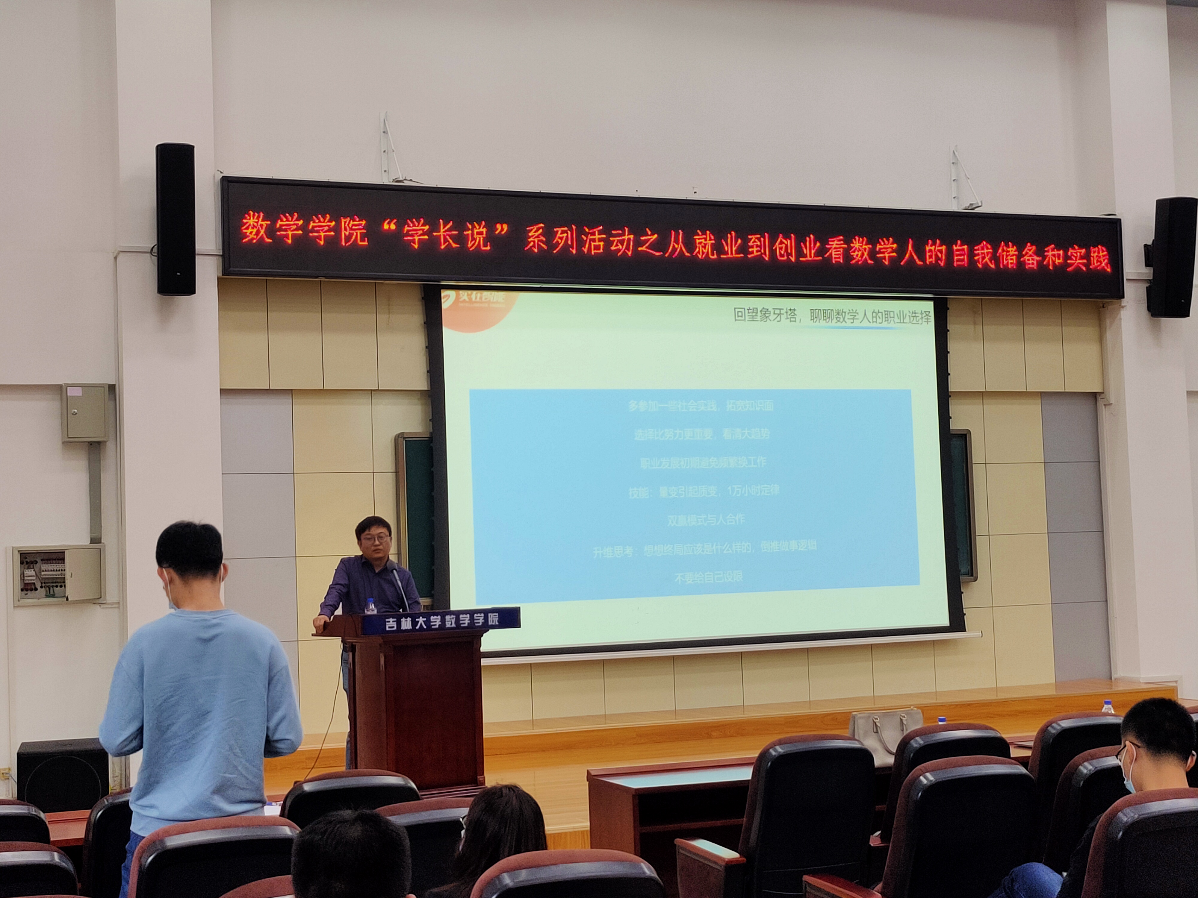 为了做好研究生的就业指导工作,帮助员工提高个人核心竞争力,利用校园时间更好的进行自我储备,公海gh555000aa线路检测策划了“学长说”系列活动,并于2021年9月28日在数学楼二楼报告厅举办了第一期活动。本次活动特别邀请了实在智能公司的创始人兼CEO孙林君以及孙跃刚两位老师作为主讲嘉宾。
