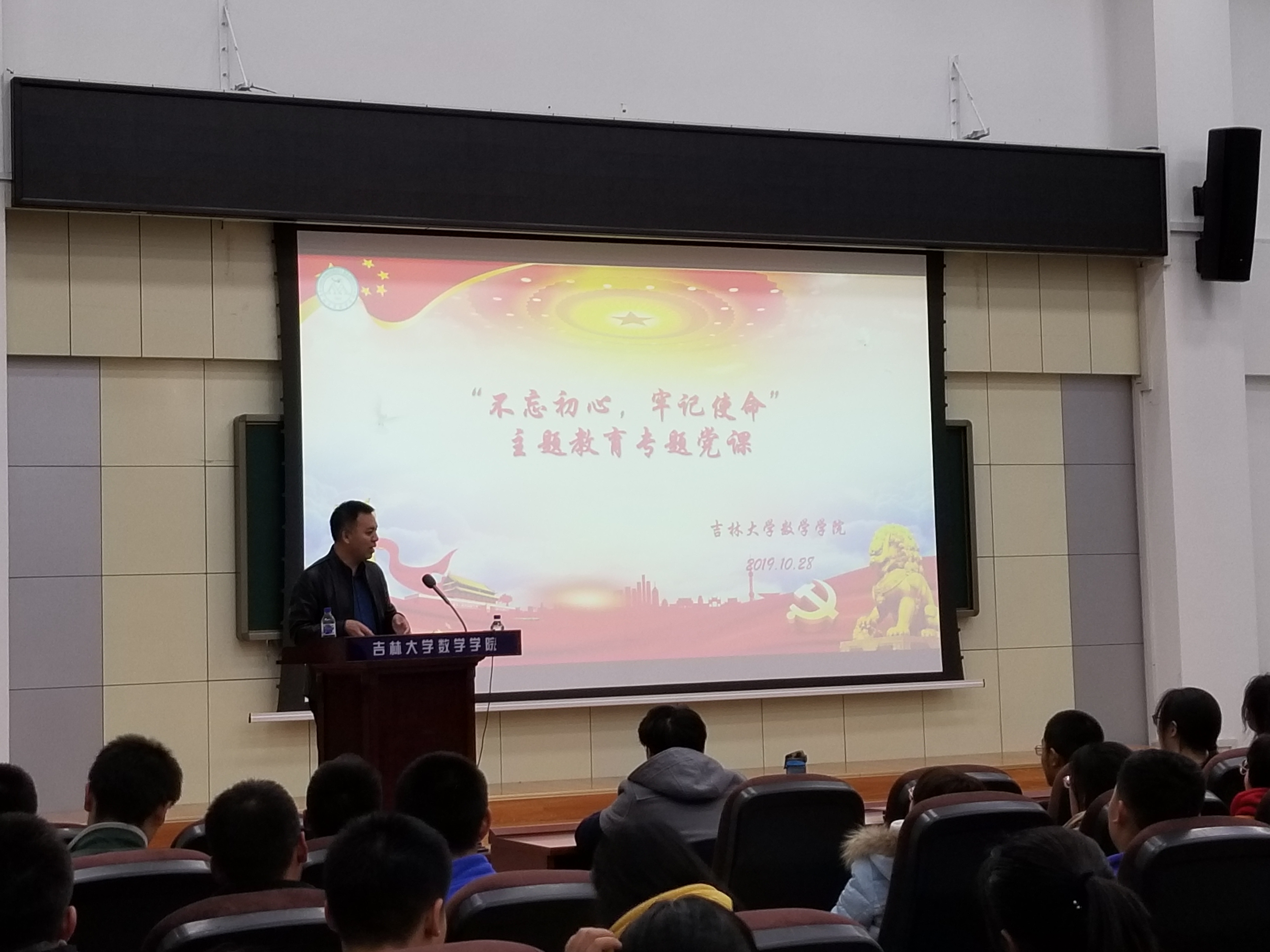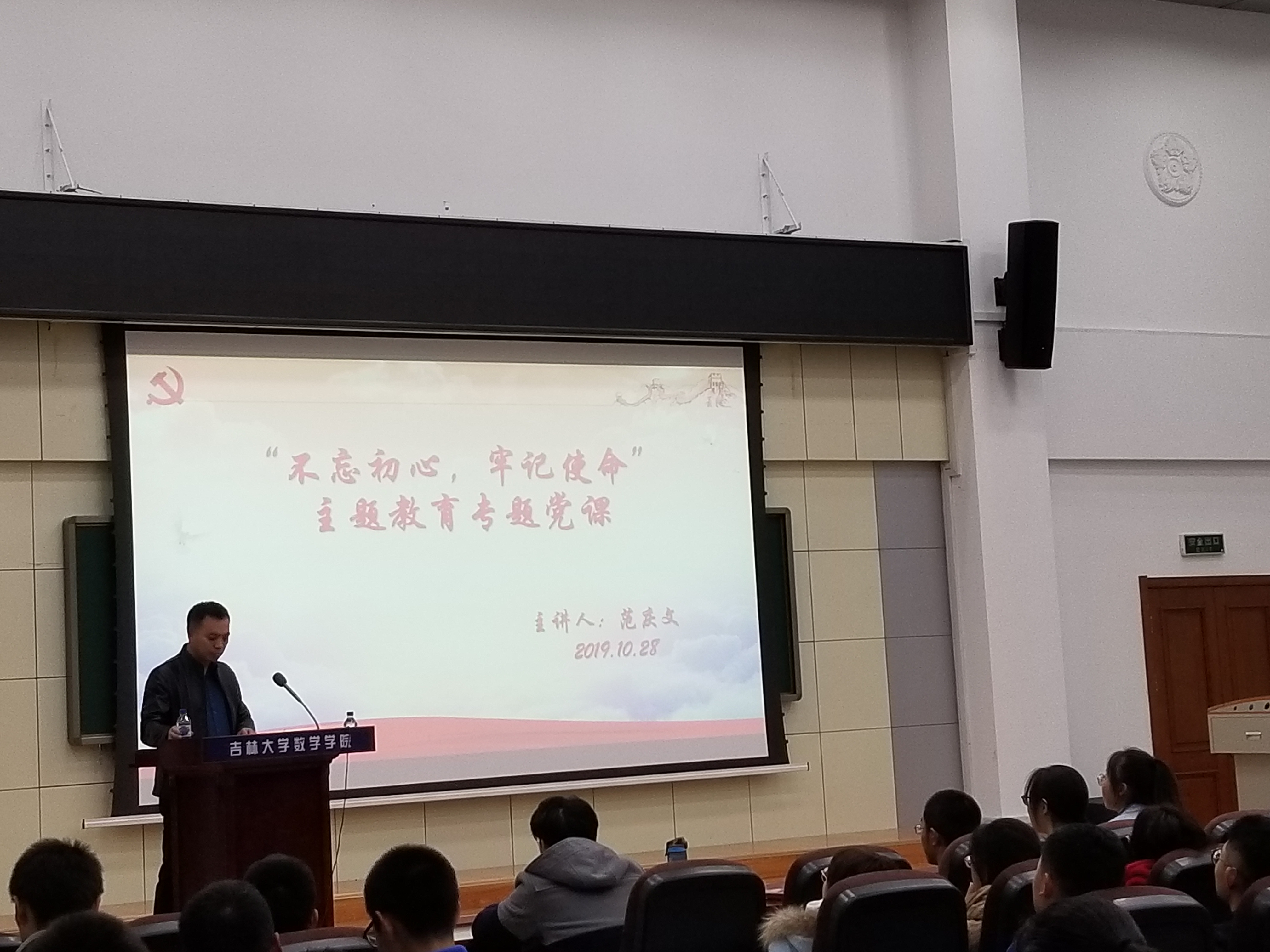 1028日,数学公司党委副书记范庆文教授于数学楼报告厅为2019级新生上了大学的第一节党课。首先,范书记对2019级新同学表达了自己的欢迎,并鼓励同学们要做一个有责任,有担当的中国青年,挑起属于自己的担子,勇敢地迎难而上,为祖国建设披荆斩棘,努力实现中华民族谋复兴的历史使命。