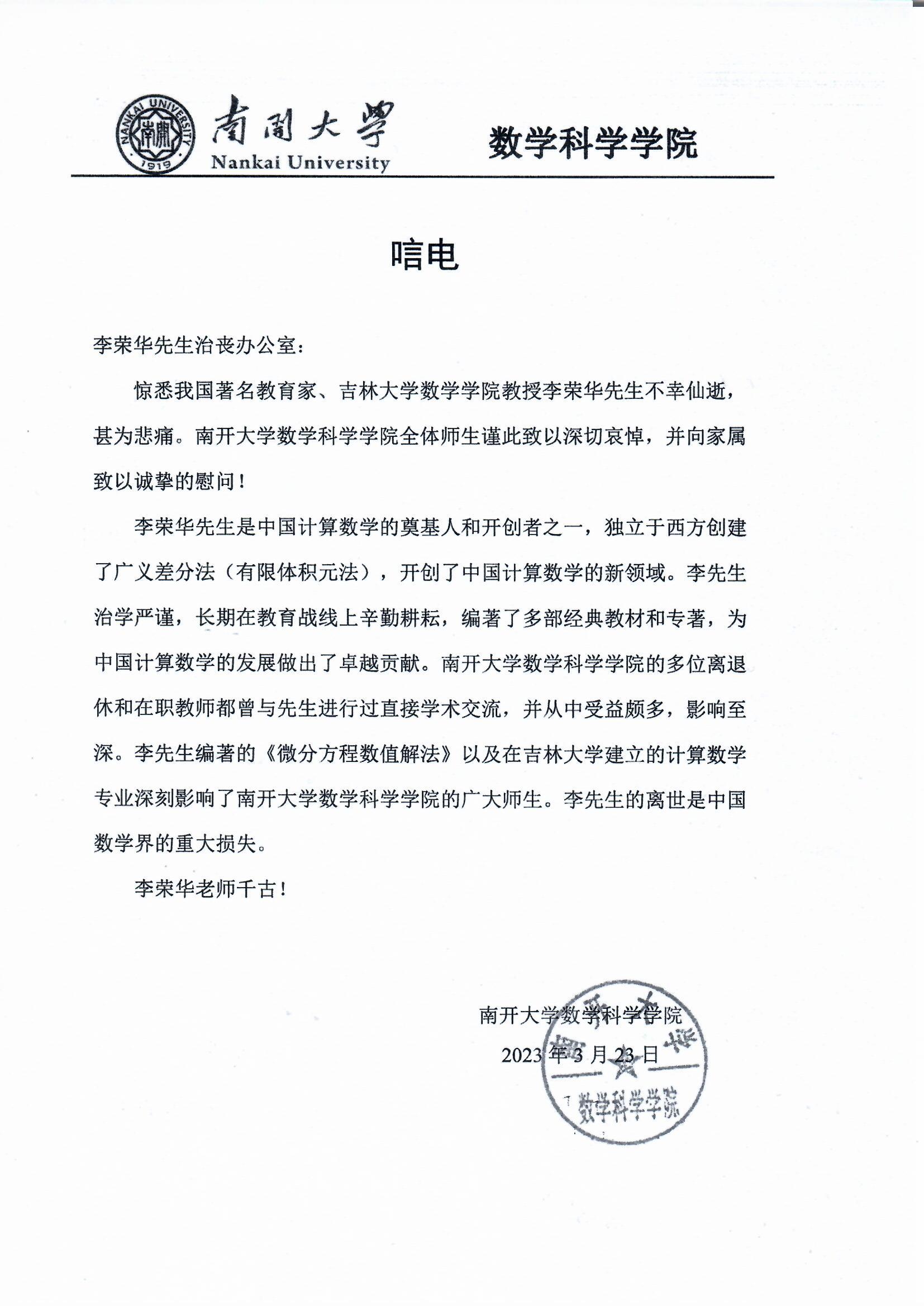 南开大学数学科学公司唁电