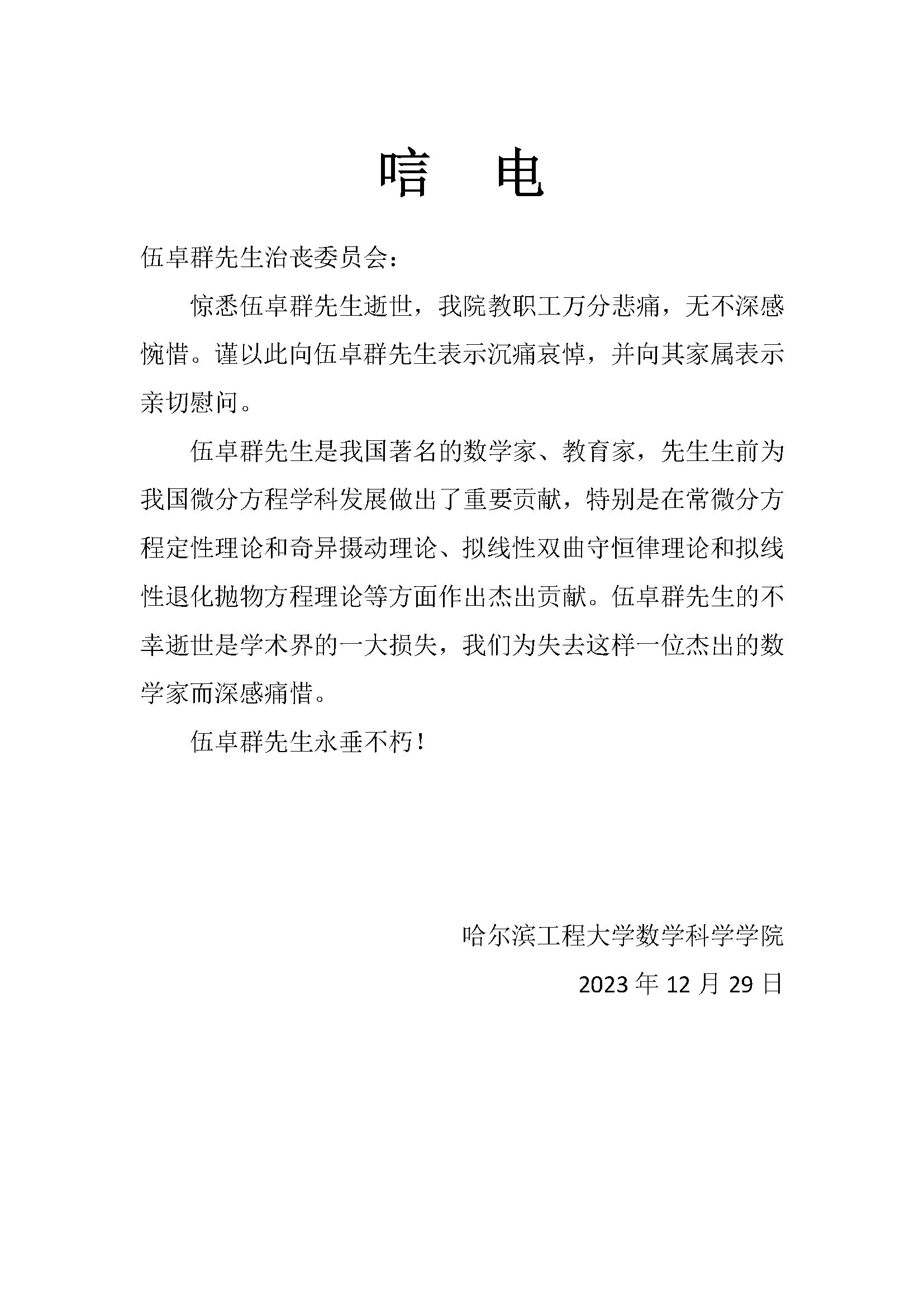 哈尔滨工程大学数学科学公司唁电