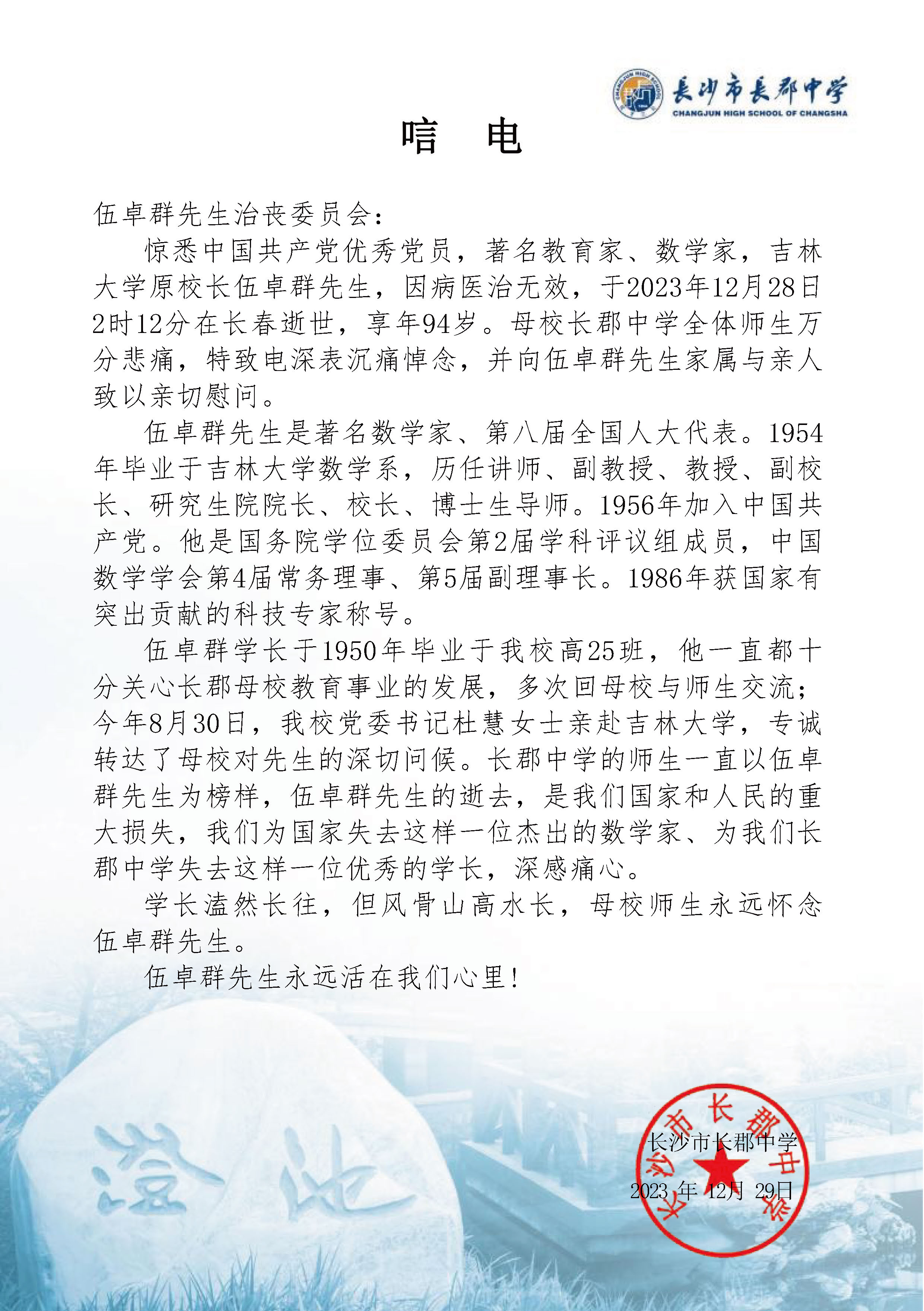 长沙市长郡中学唁电