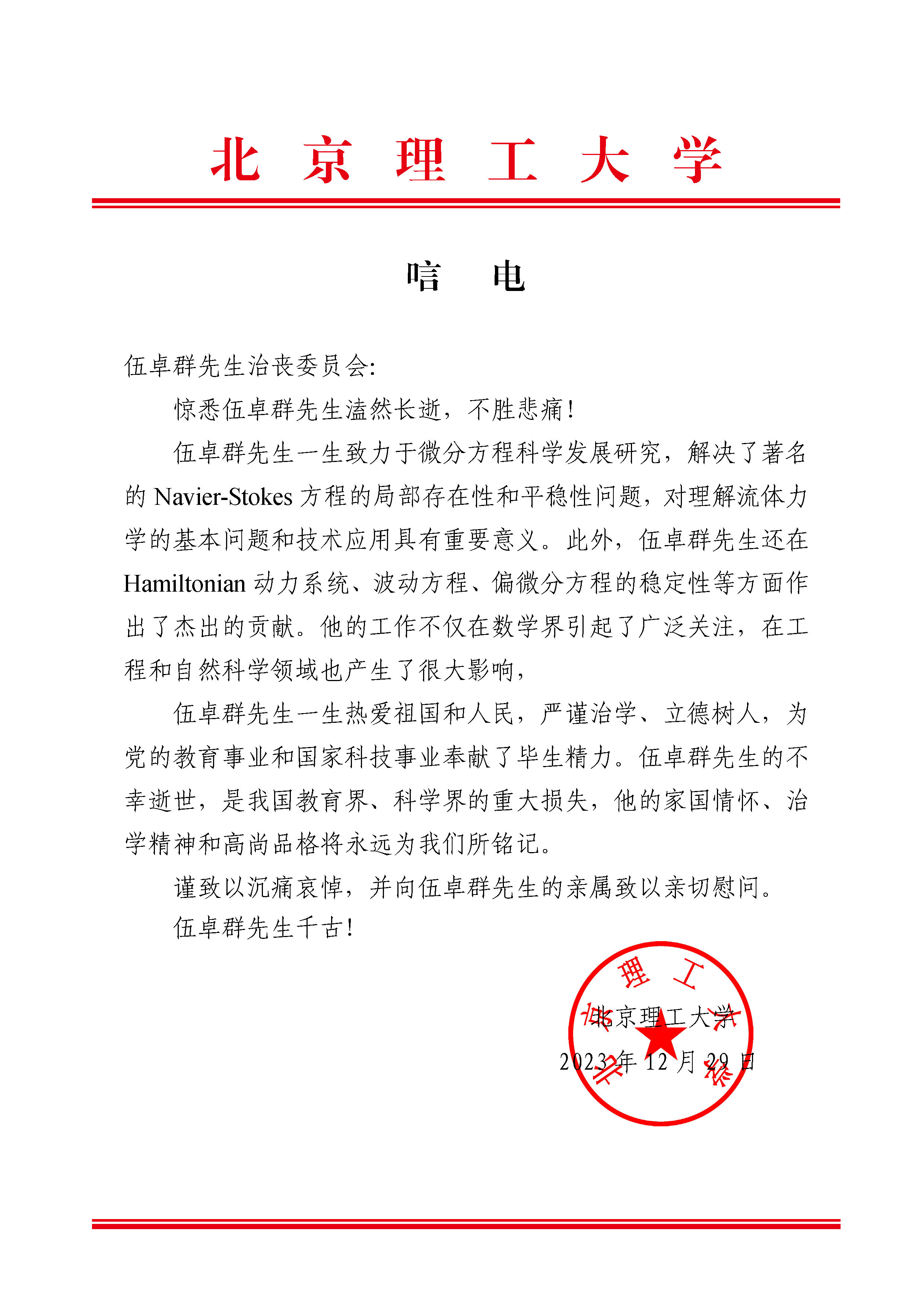 北京理工大学唁电