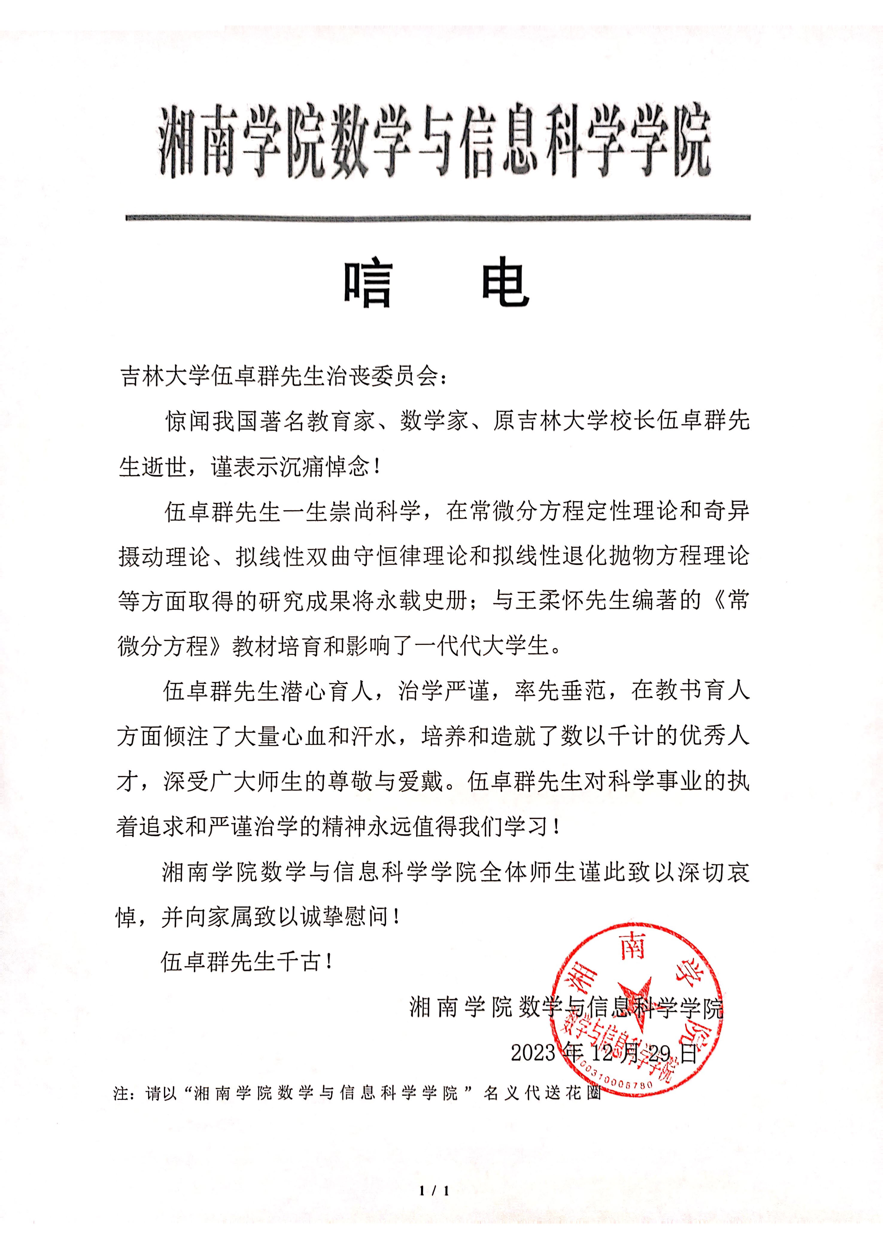 湘南公司数学与信息科学公司唁电