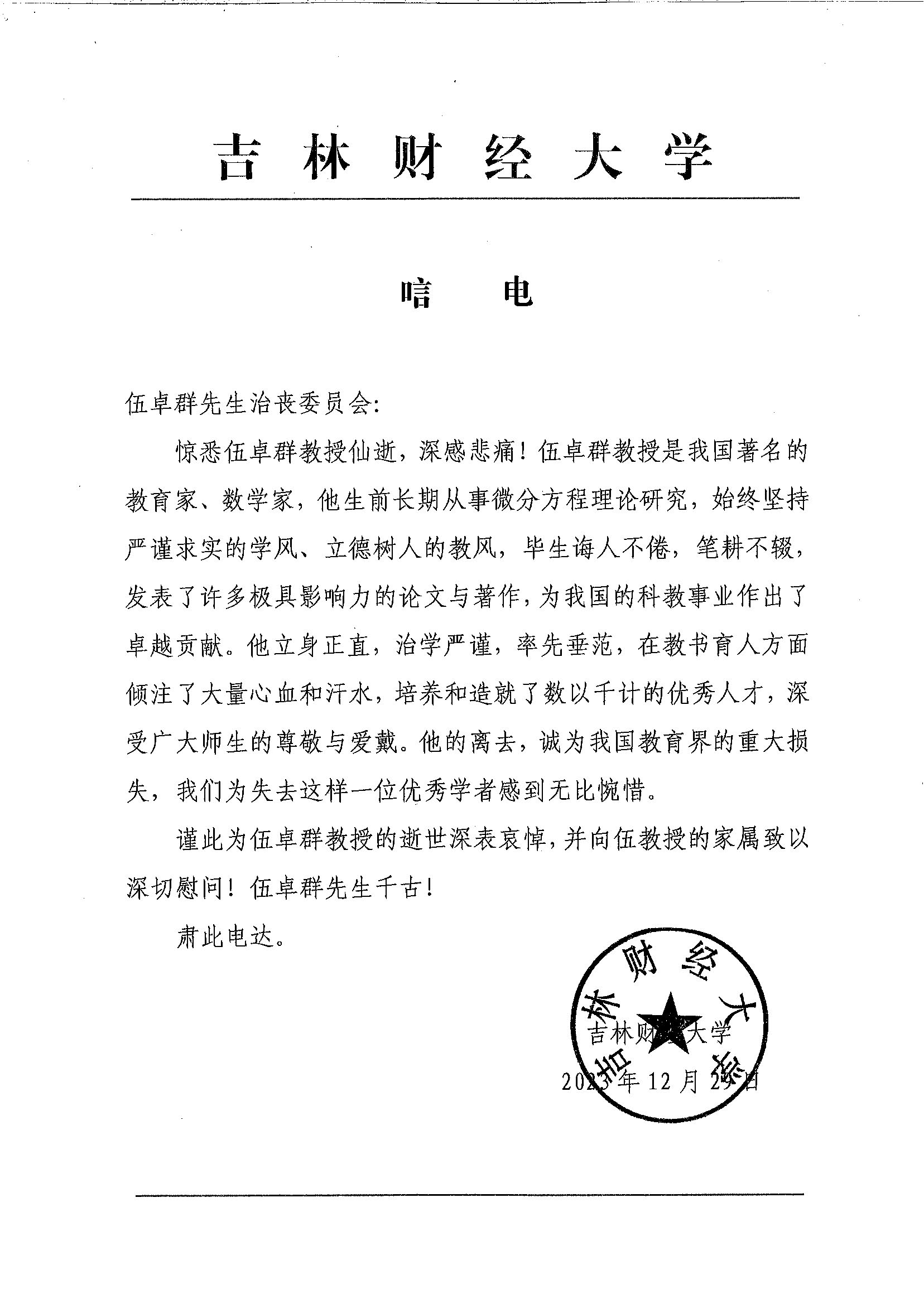 吉林财经大学唁电