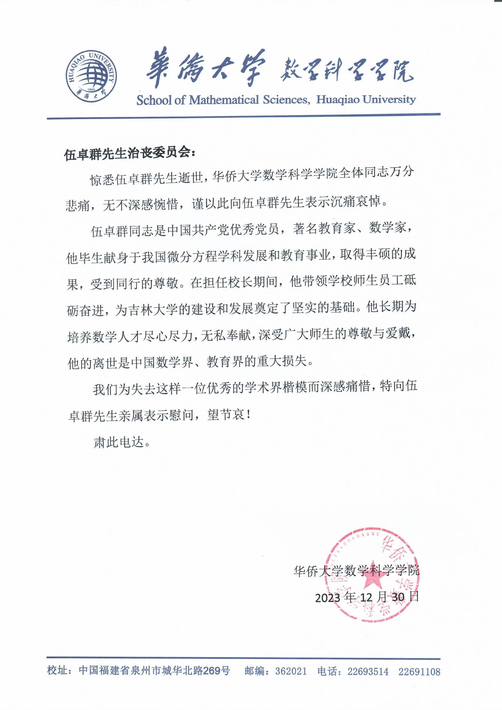 华侨大学数学科学公司唁电